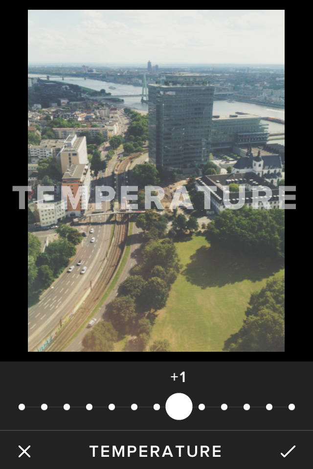 Von Lichter, Tiefen, Sättigung, Temperatur bis über Ausfaden, Einfärben und Hautfarben-Verbesserer stehen einem so einige gute Bild-Bearbeitungs-Funktionen zur Verfügung. Ähnlich wie in Lightroom oder Bridge. Per Slider kann man jeweils die Stärke des Filters oder Werkzeugs einstellen. Die Zahl wird immer auf dem Bild angezeigt. Die ganze App hat wirklich eine tolle Optik mit der Schrift in Versalien über den Bildern.